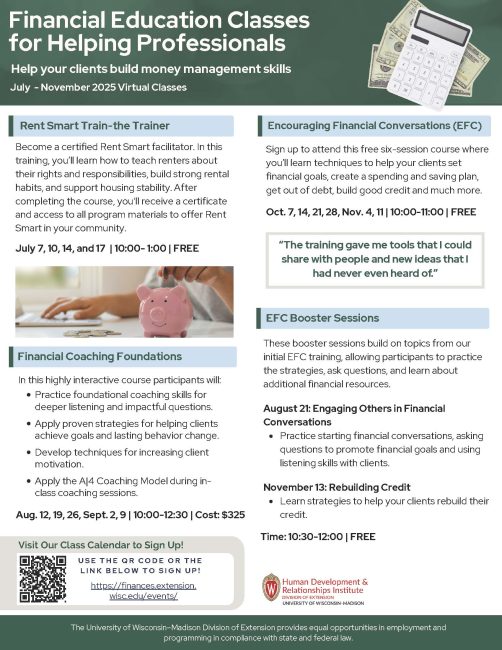 Join our Financial Education Classes covering budgeting, smart money moves, rental readiness, and more—offered by UW–Madison Extension educators.