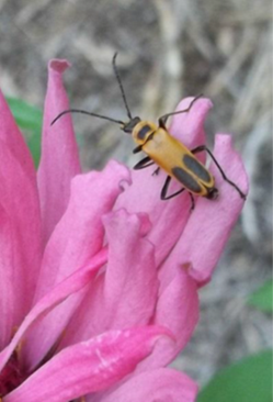 We usually see the goldenrod soldier beetle, Chauliognathus pennsylvanicus, also called the Pennsylvania Leatherwing. The adult goldenrod soldier beetle is dark yellow in color and reaches about ½-inch in length. It sports a black head with a black spot behind the head. It also has a black, oval-shaped spot on each wing cover. August and September are the months we see the adults most active in the garden.