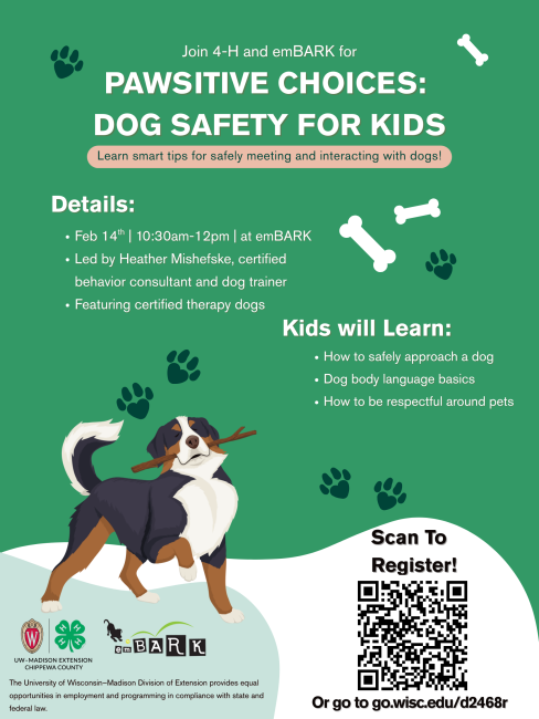 Chippewa County 4‑H is partnering with emBARK in Eau Claire for a special session on February 14 from 10:30 a.m. to noon. Participants will explore dog safety, canine body language, and respectful ways to interact with pets. The workshop will be led by Heather Mishefske, behavior consultant and dog trainer.