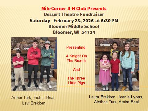 Join the Mile Corner 4‑H Club for their Dessert Theater Fundraiser on Saturday, February 28, 2026, at 6:30 p.m. at Bloomer Middle School! Enjoy delicious desserts and performances of A Knight on the Beach and The Three Little Pigs.